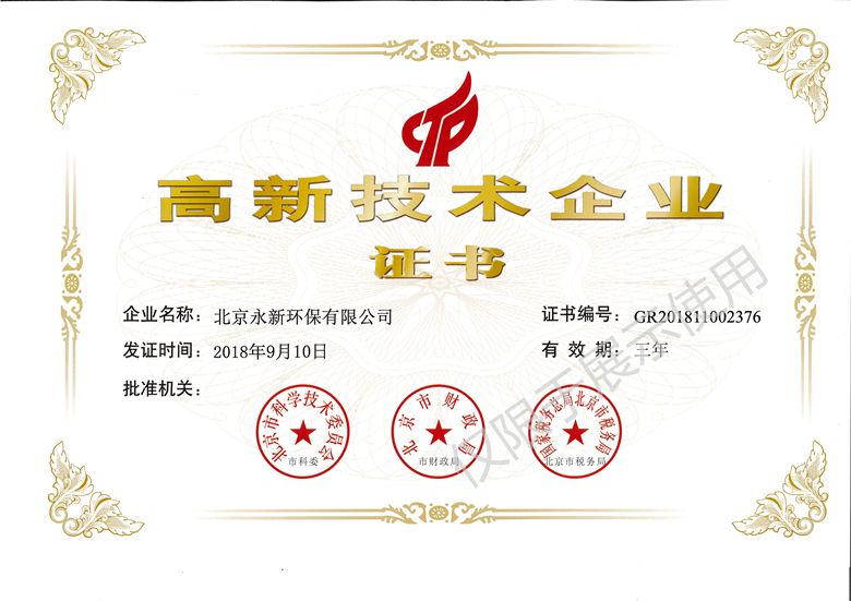 2018年9月10日,根據《高新技術企業認定管理辦法》(國科發火〔2016〕32號)和《高新技術企業認定管理工作指引》(國科發火〔2016〕195號)有關規定,全國高新技術企業(以下簡稱“高企”)認定管理工作領導小組辦公室將北京市2018年第二批1206家企業擬認定高企名單予以公示,自證書頒發之日起有效期為三年,北京永新環保有限公司位列第576號。