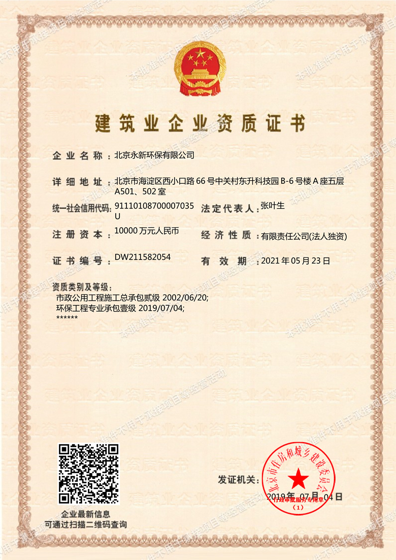 2019年7月4日,從北京市住房和城鄉建設廳獲悉,我公司申報的環保工程專業承包資質壹級順利通過。